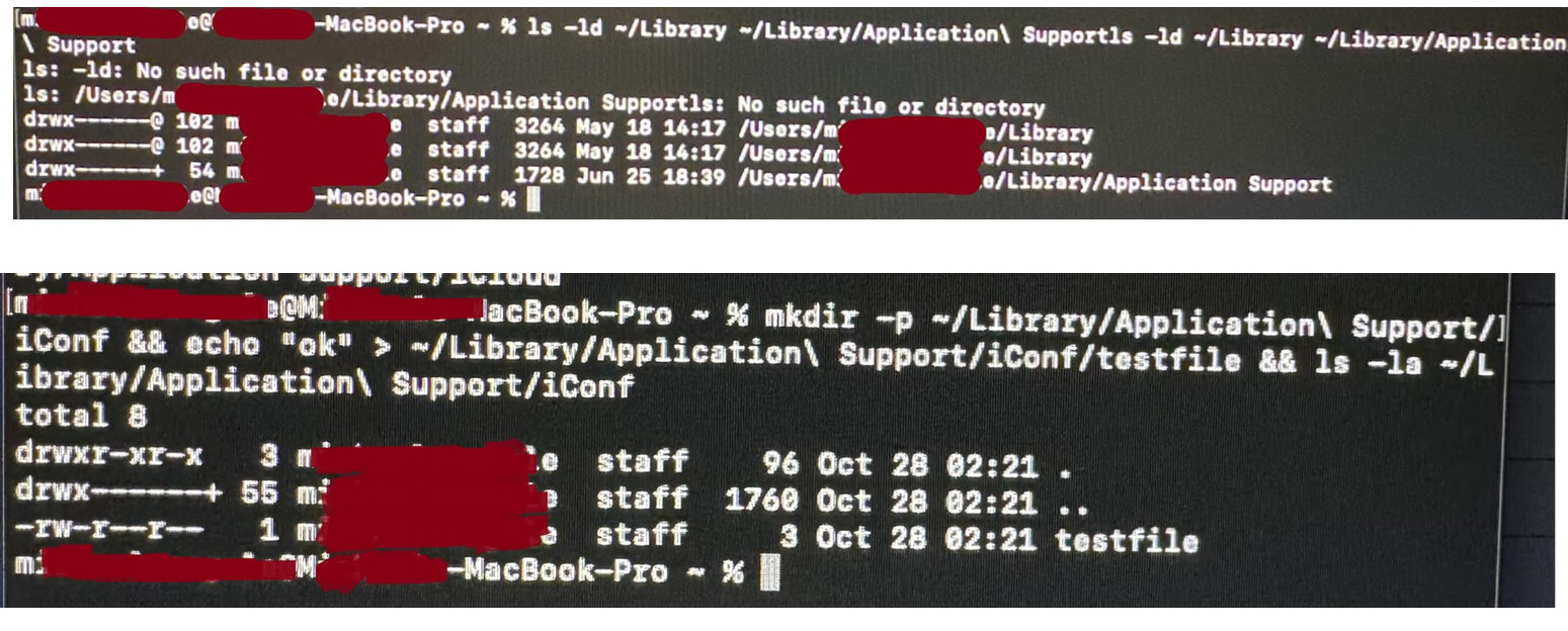 In the top half of the below screenshot, you’ll see their permissions for their Library and Application Support directories given by ls -ld